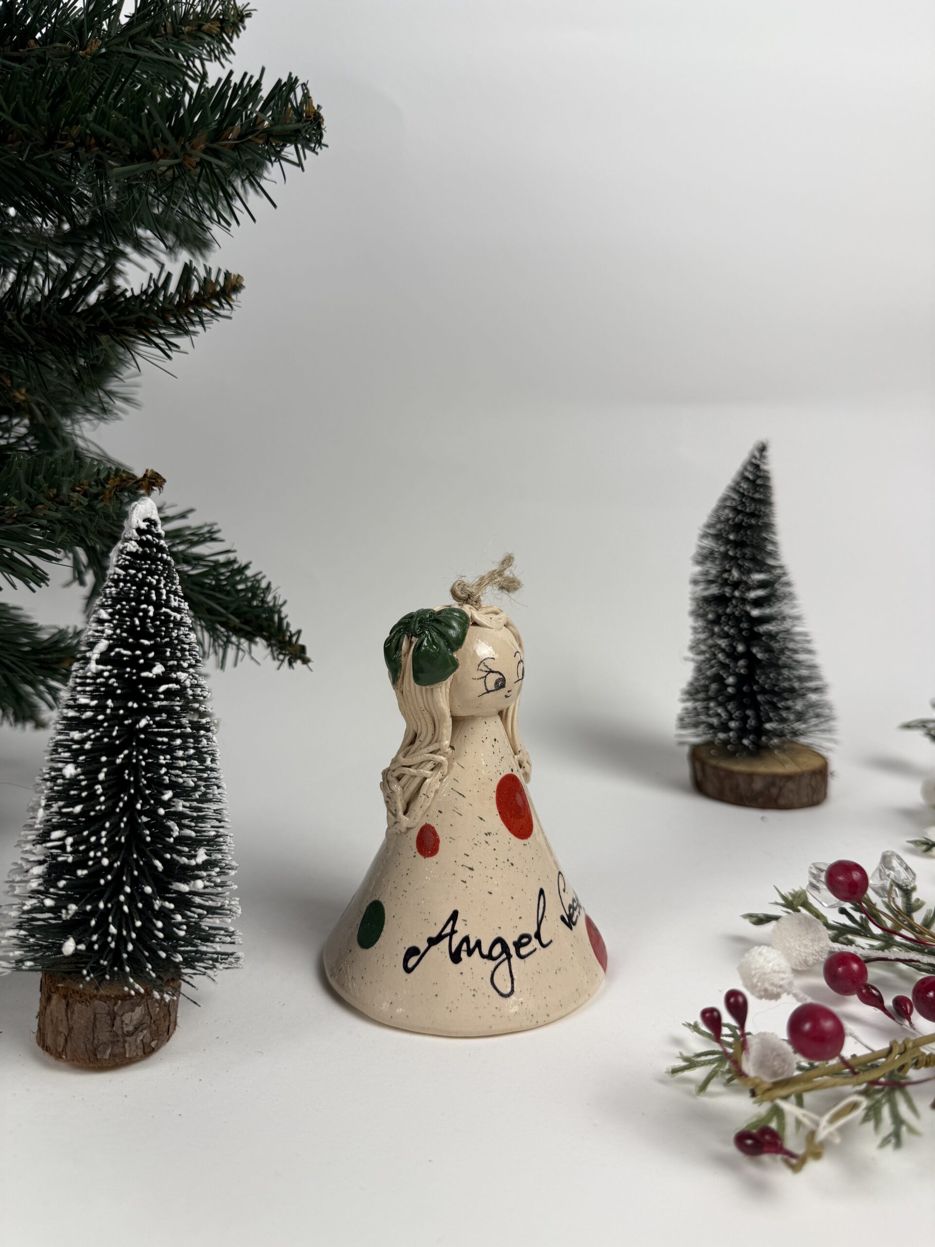 Keramični, unikatni angel narejen iz bele gline, ki ga lahko uporabimo za okras ob različnih priložnostih na različnih mestih, odlično pa se poda tudi na novoletno jelko. Z izdelkom si popestrimo svoj dom po lastni izbiri ali pa angel podarimo sebi dragi osebi in jo spomnimo, da mislimo nanjo. Angel je trden in odporen, saj je narejen iz visoko kvalitetne bele gline ter žgan na visoki temperaturi 1050°C.