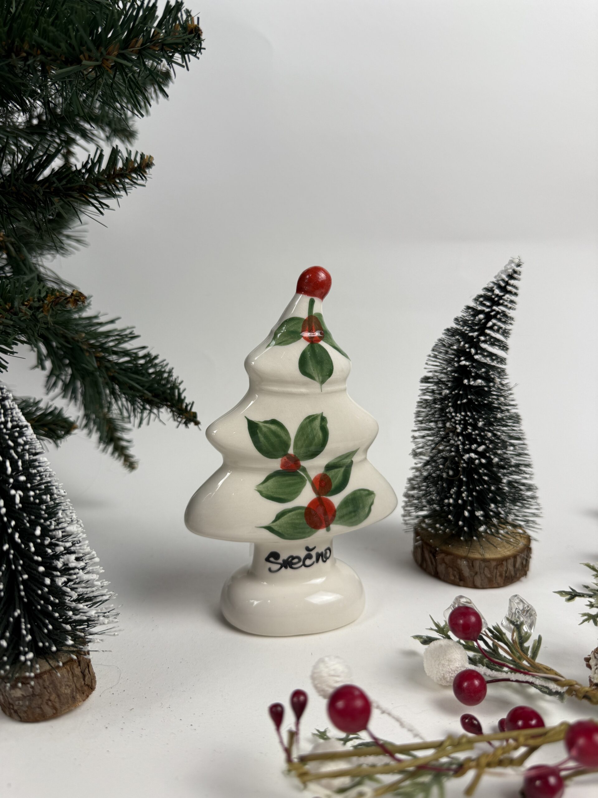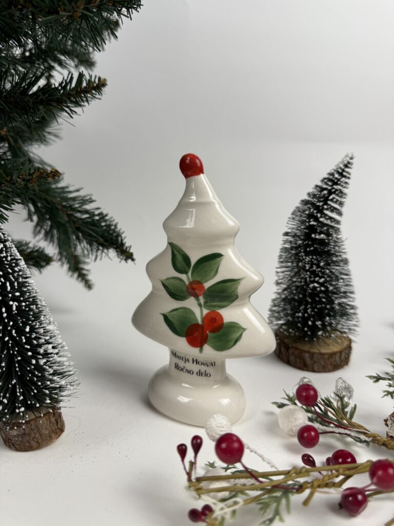Keramična, unikatna smrekica narejena iz bele gline, ki jo lahko uporabimo za okras ob različnih priložnostih na različnih mestih.
