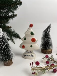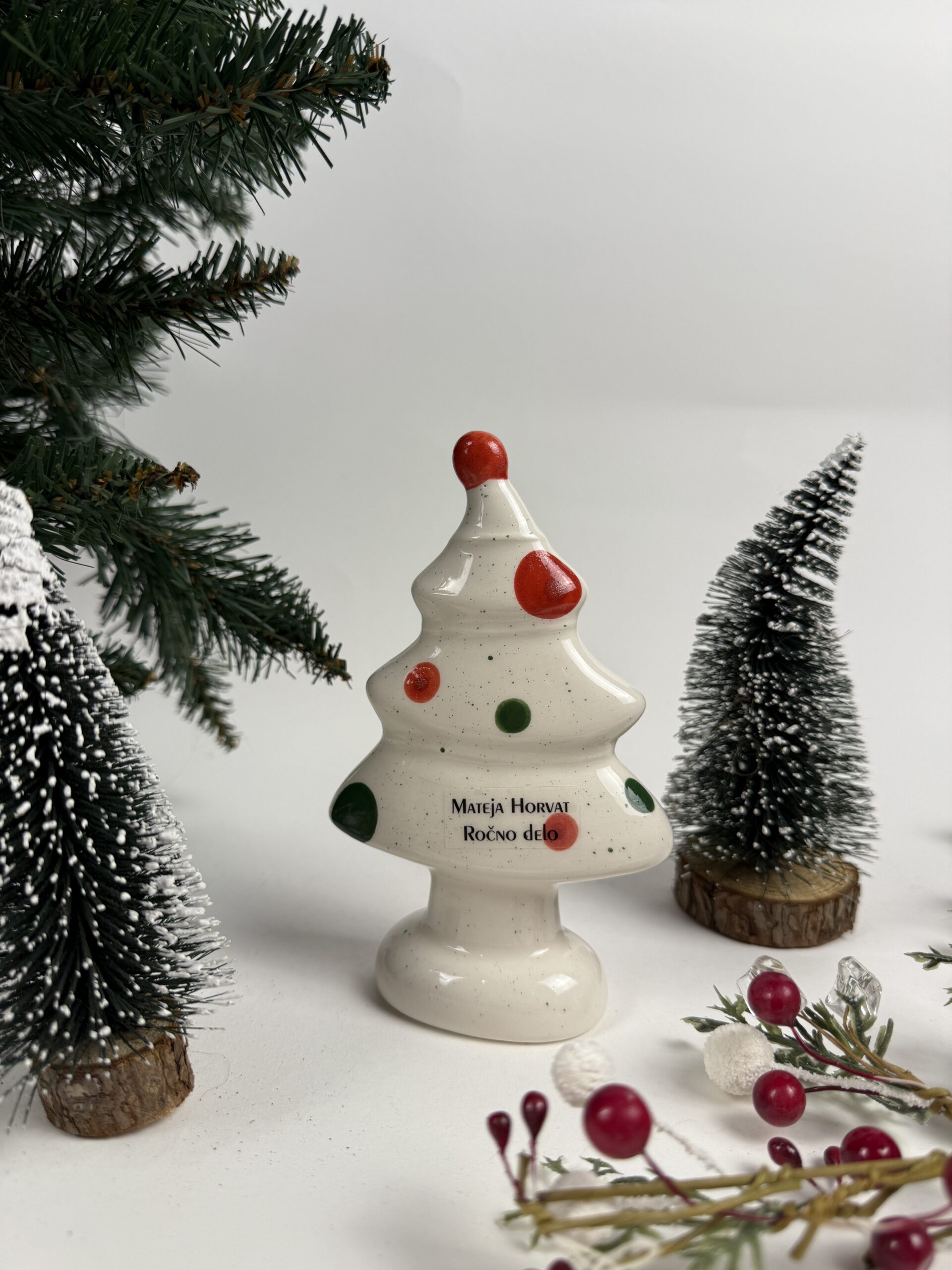 Keramična, unikatna smrekica narejena iz bele gline, ki jo lahko uporabimo za okras ob različnih priložnostih na različnih mestih.