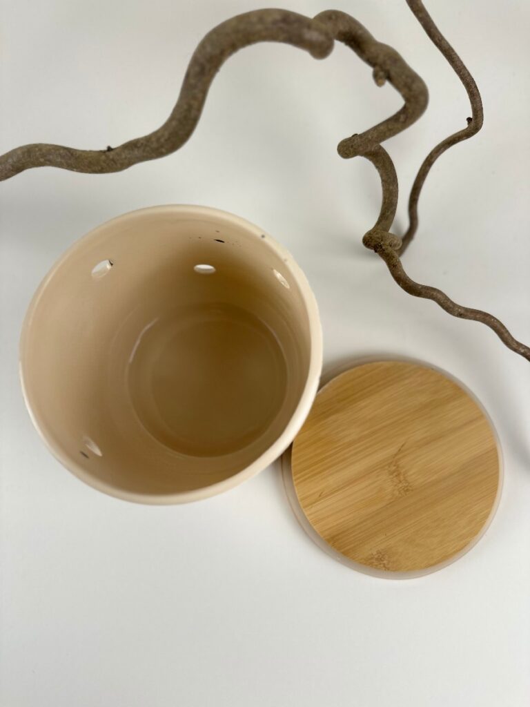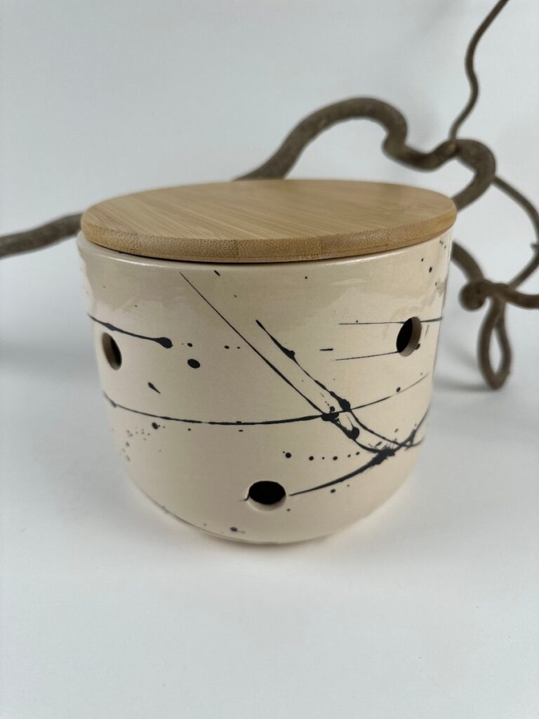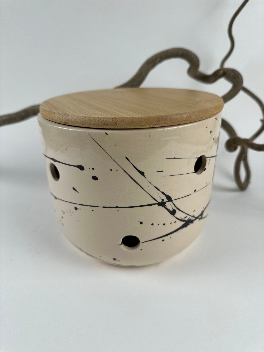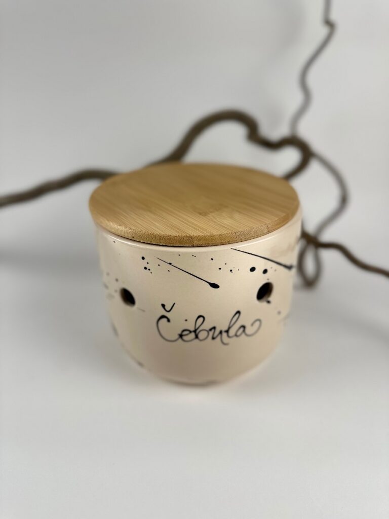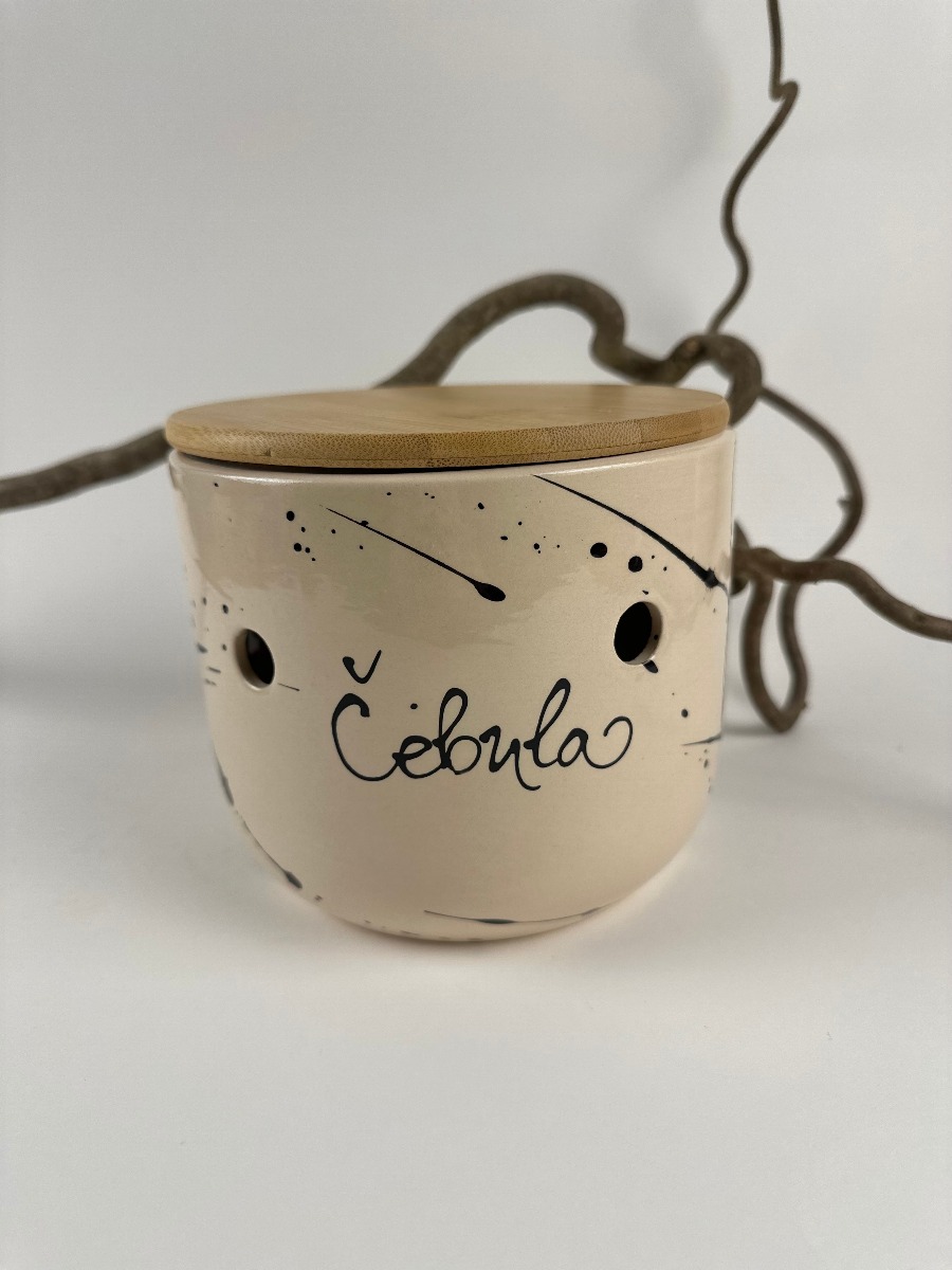 Ročno izdelan keramični čebulnik z lesenim pokrovom je praktičen način za shranjevanje čebule. Zračne odprtine omogočajo, da vsebina ostane sveža dlje časa, lesen pokrov pa doda naraven zaključek in poskrbi, da se posoda lepo vklopi v vsak kuhinjski kotiček.