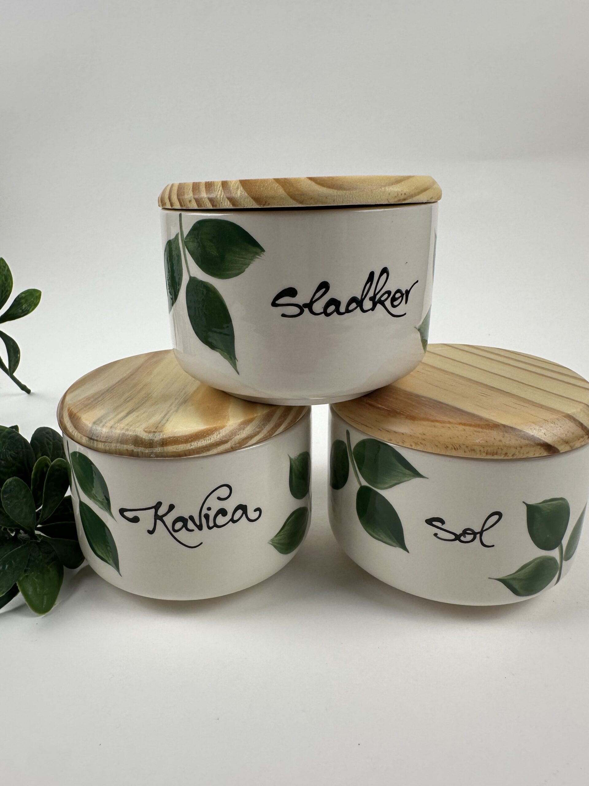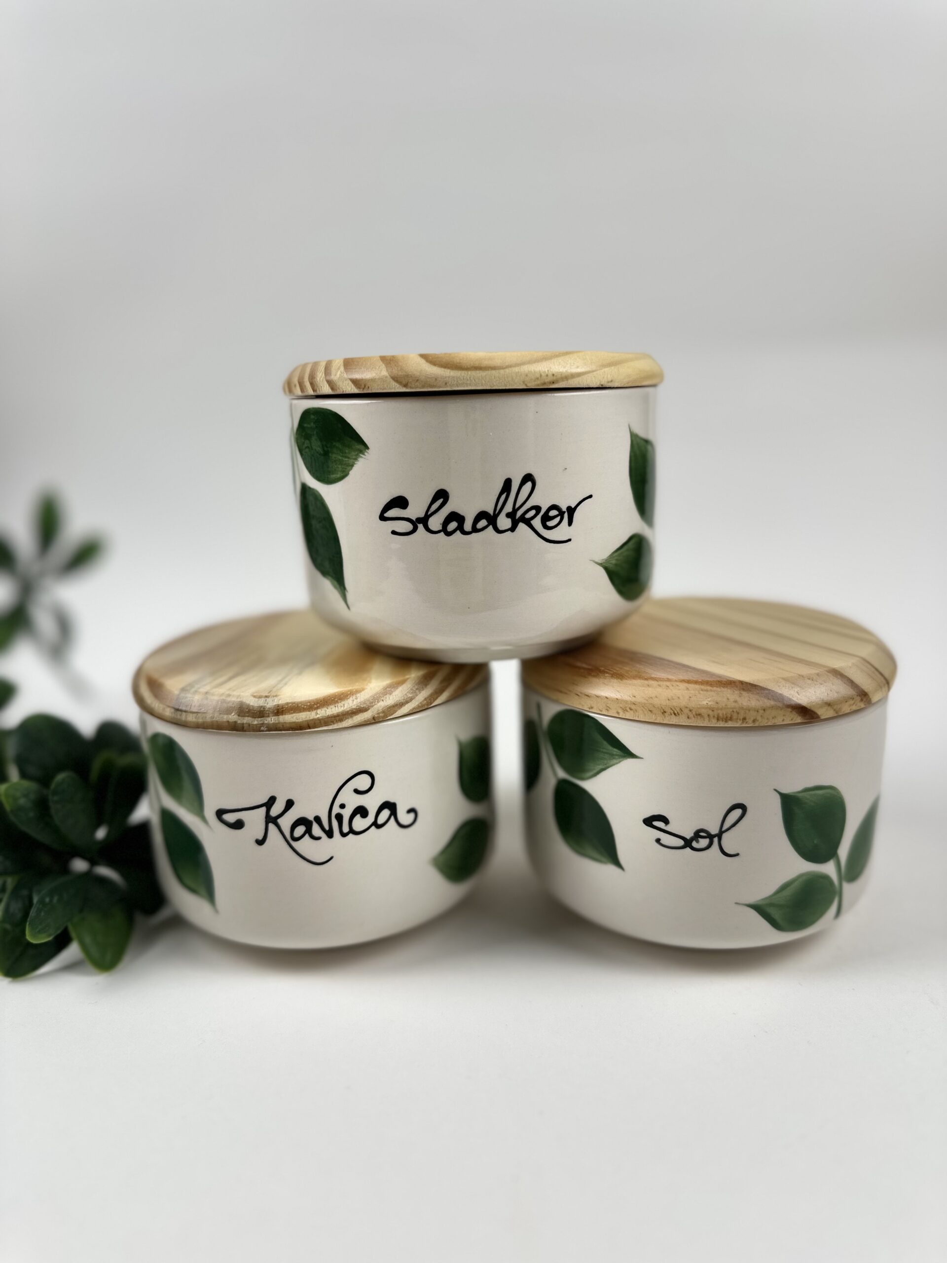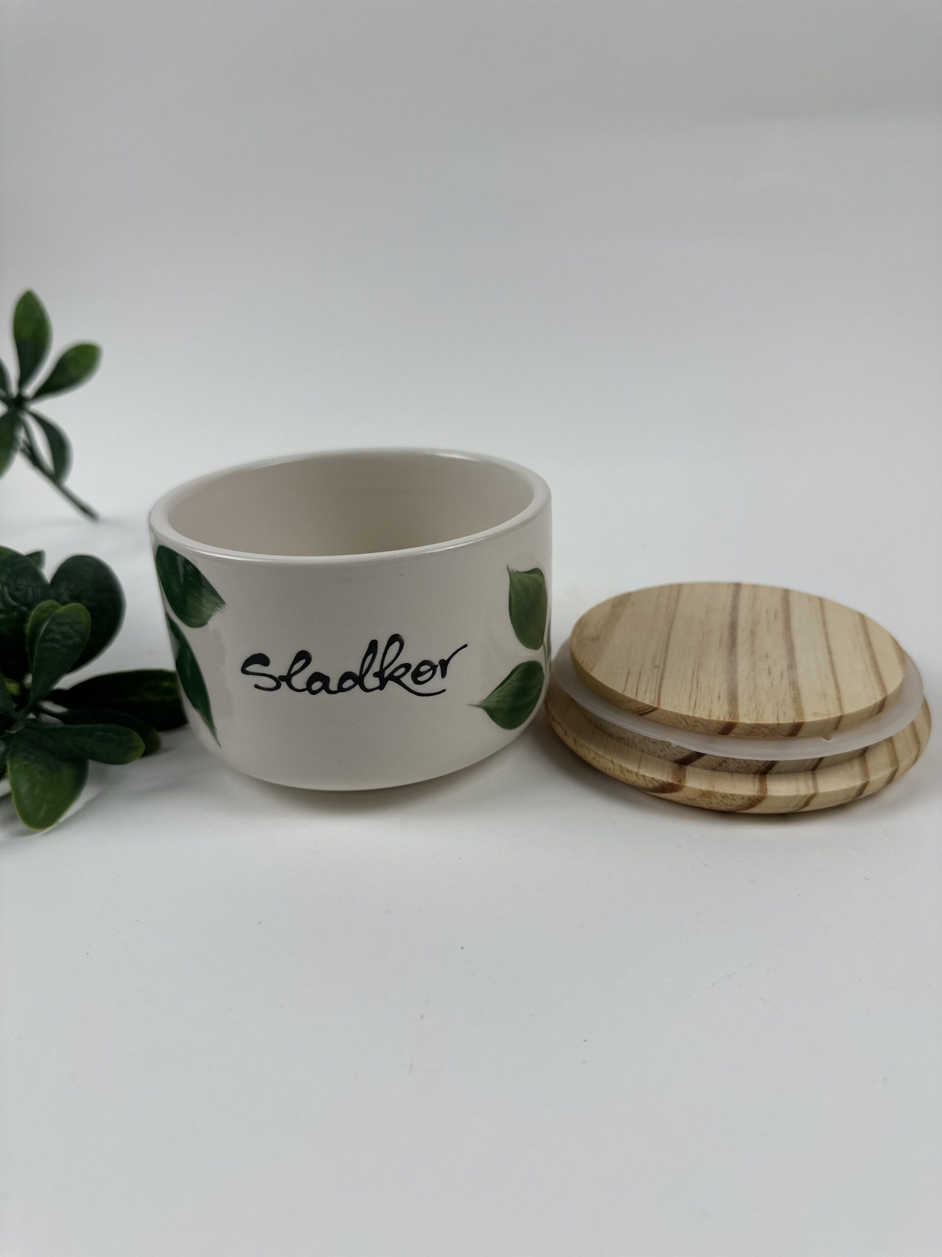 Ročno izdelana keramična mala doza s pokrovom, primerna za shranjevanje sladkorja, soli, začimb ali drugih drobnih dodatkov, ki jih želiš imeti pri roki ali lepo postaviti na mizo.