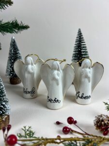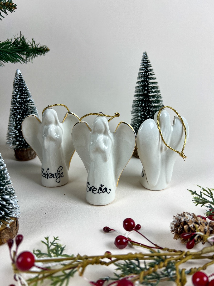 Keramični, unikatni angel narejen iz bele gline, ki ga lahko uporabimo za okras ob različnih priložnostih na različnih mestih, odlično pa se poda tudi na novoletno jelko. Višina: 9cm Širina: 7cm