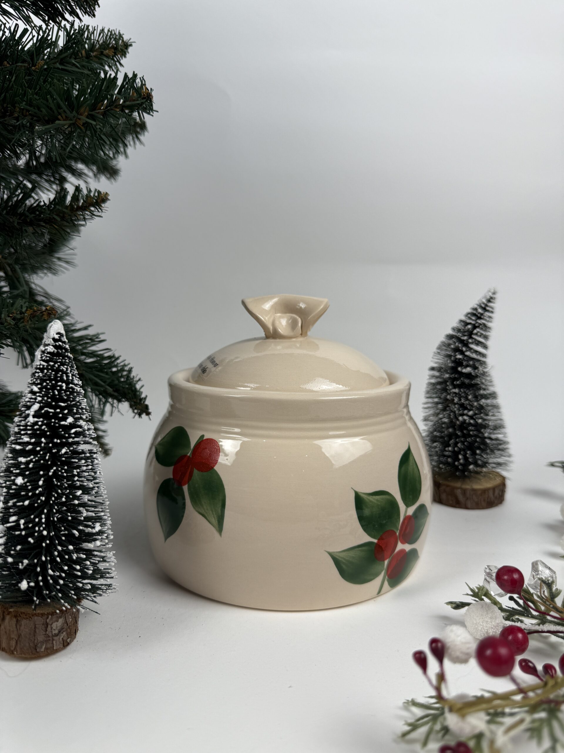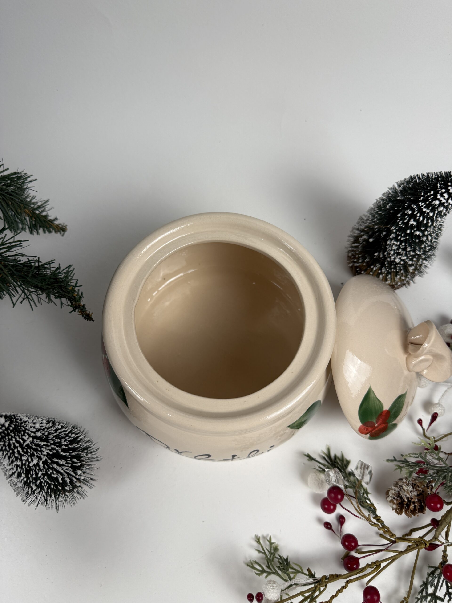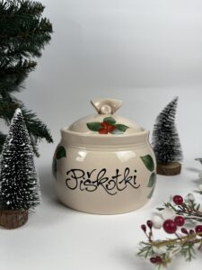 Ročno izdelan piškotnik s pokrovom, popoln za shranjevanje tvojih najljubših piškotov. S svojo zaobljeno obliko in pokrovom, ki lepo zapre vsebino, je hkrati uporaben in okrasen kos – za kuhinjo, jedilnico ali mizo, pripravljeno na razvajanje.