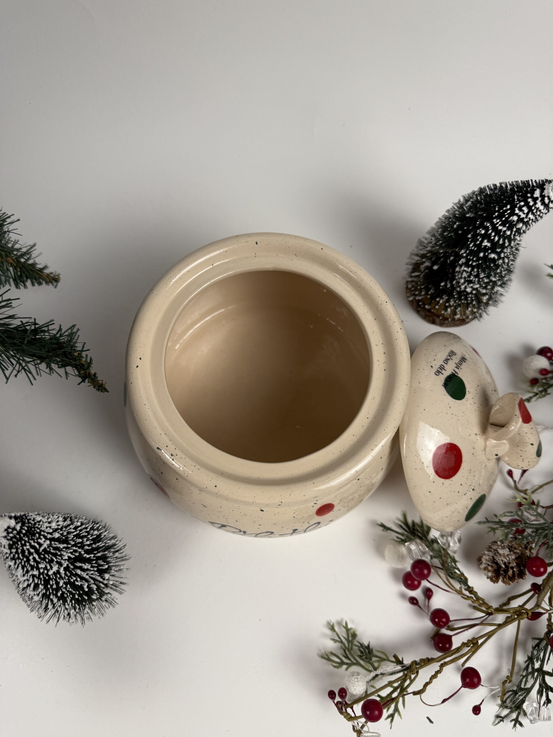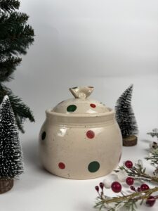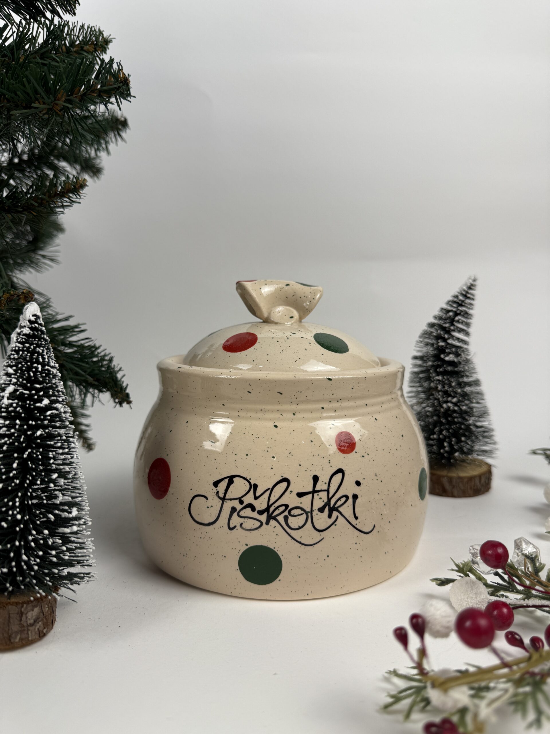 Ročno izdelan piškotnik s pokrovom, popoln za shranjevanje tvojih najljubših piškotov. S svojo zaobljeno obliko in pokrovom, ki lepo zapre vsebino, je hkrati uporaben in okrasen kos – za kuhinjo, jedilnico ali mizo, pripravljeno na razvajanje.
