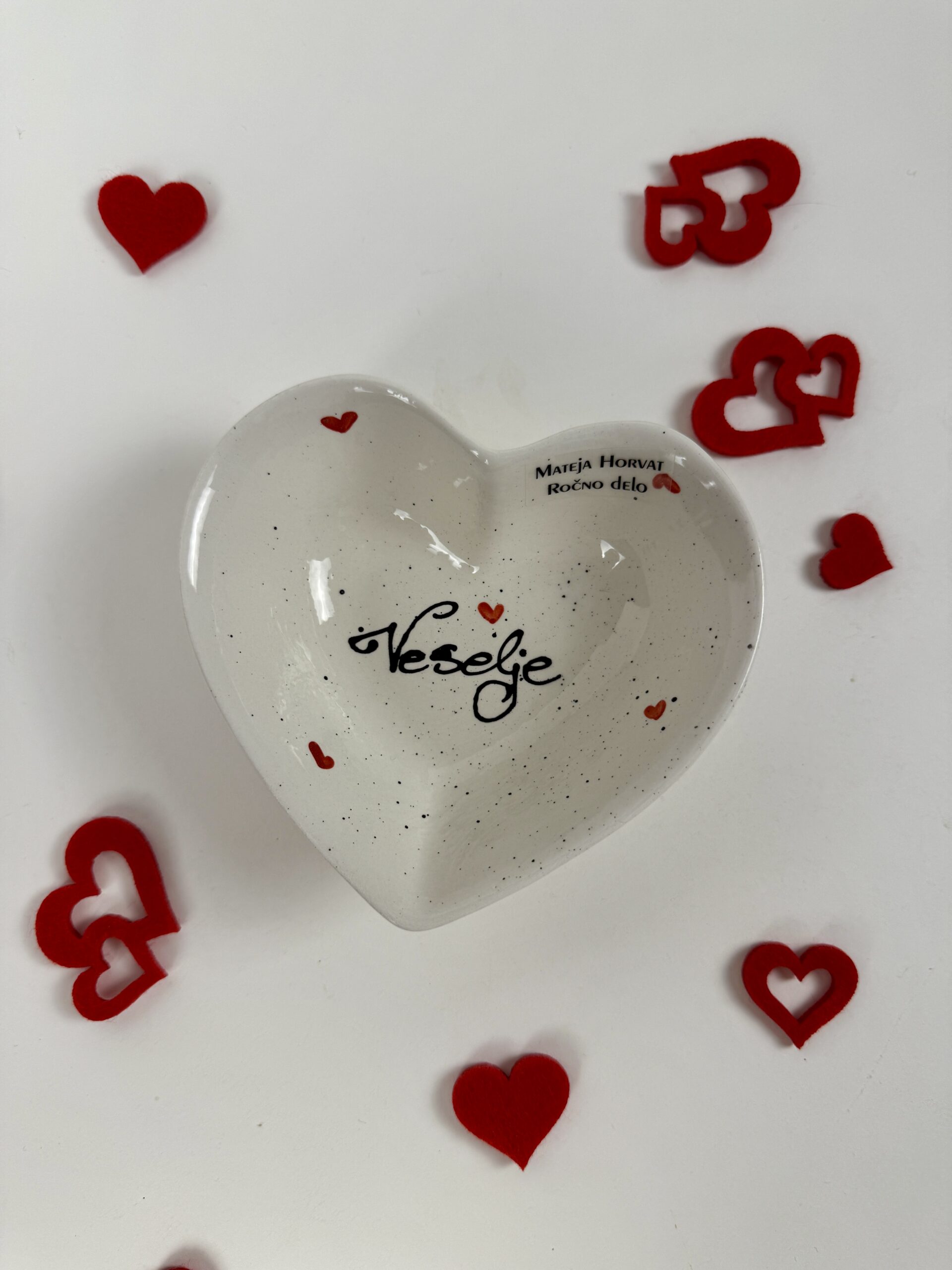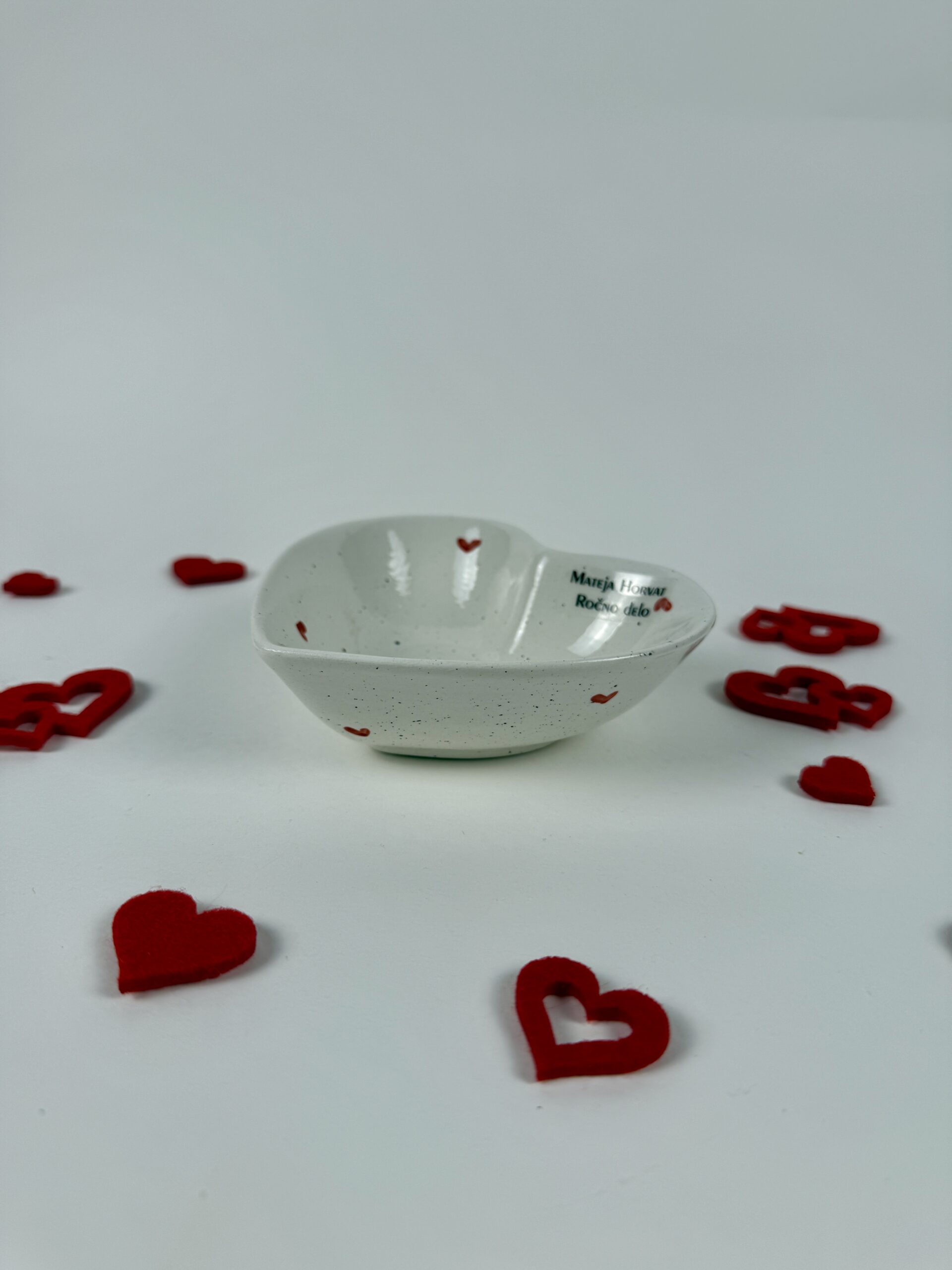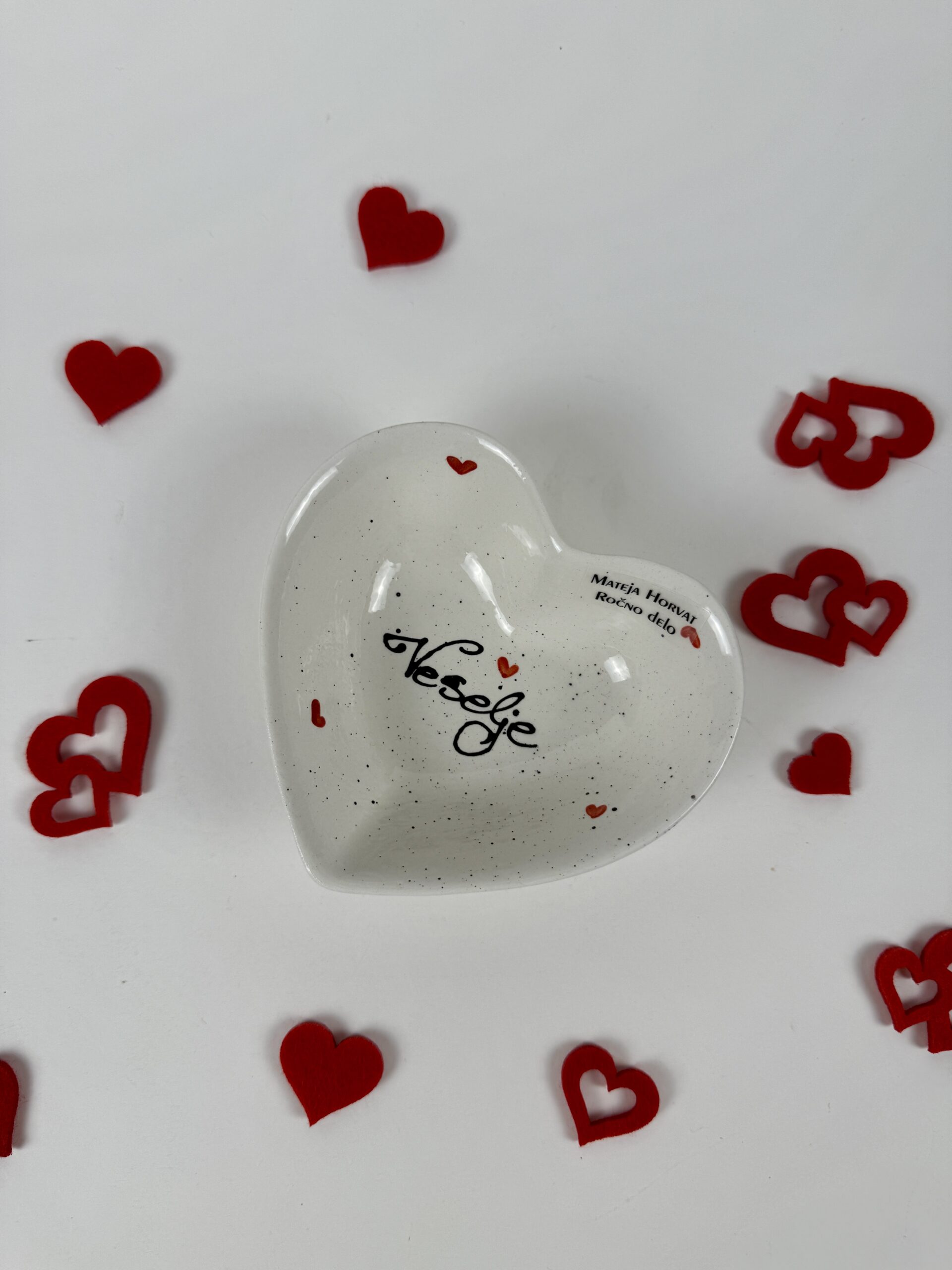 Ročno izdelana skelda v obliki srčka, ki ga lahko uporabiš za postrežbo drobnih prigrizkov, piškotov ali kot nežen prostor za nakit, svečko ali simbolno pozornost.