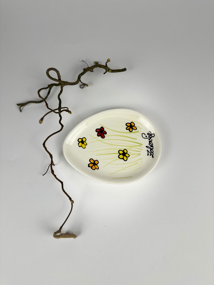 Večnamenski, ročno poslikan pladenjček, ki ga lahko uporabite pri vsakodnevnih kuhinjskih opravilih ali pa kot podstavek za različne priložnosti. Širina: 10cm Dolžina: 13cm