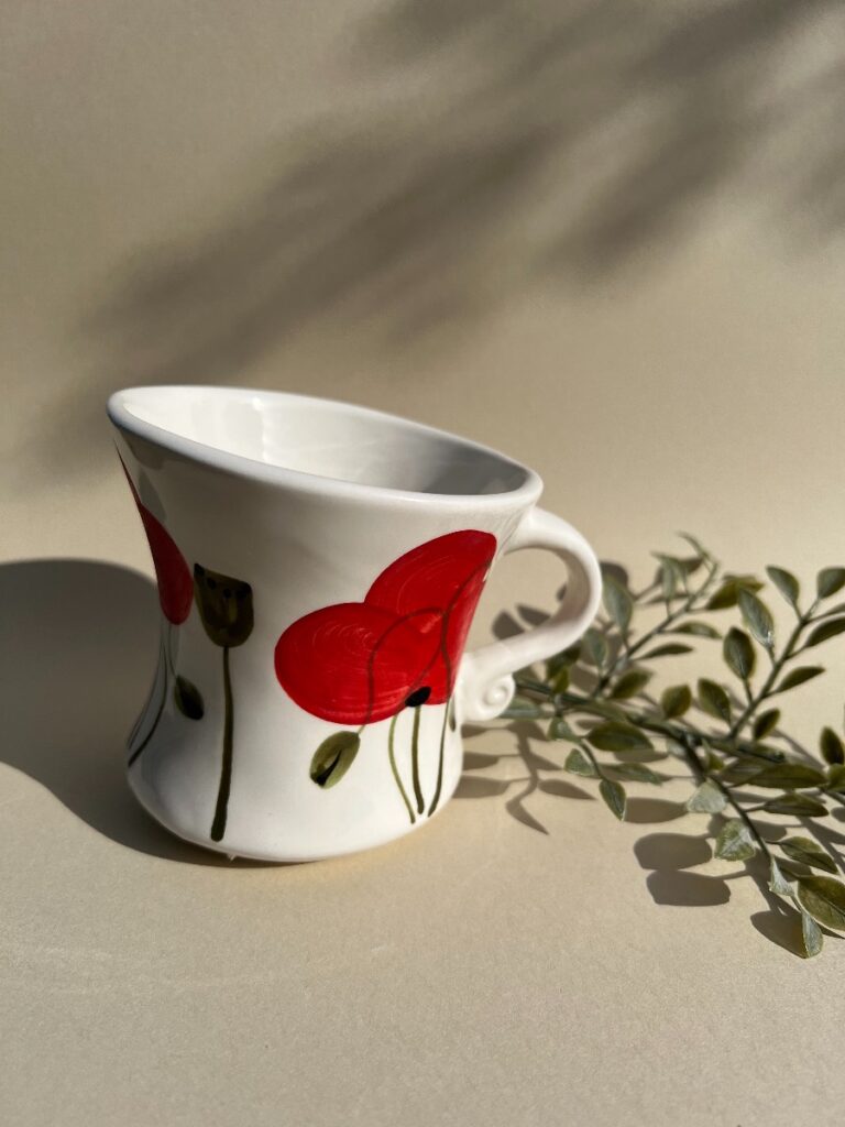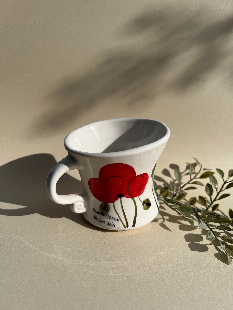 Unikatna, keramična skodelica, primerna za vsakodnevno uporabo v kuhinji kot tudi za popestritev drugih kotičkov vašega doma. Zaradi ročnega dela se izdelki lahko razlikujejo v poslikavi. Višina: 10cm Prostornina: 300ml