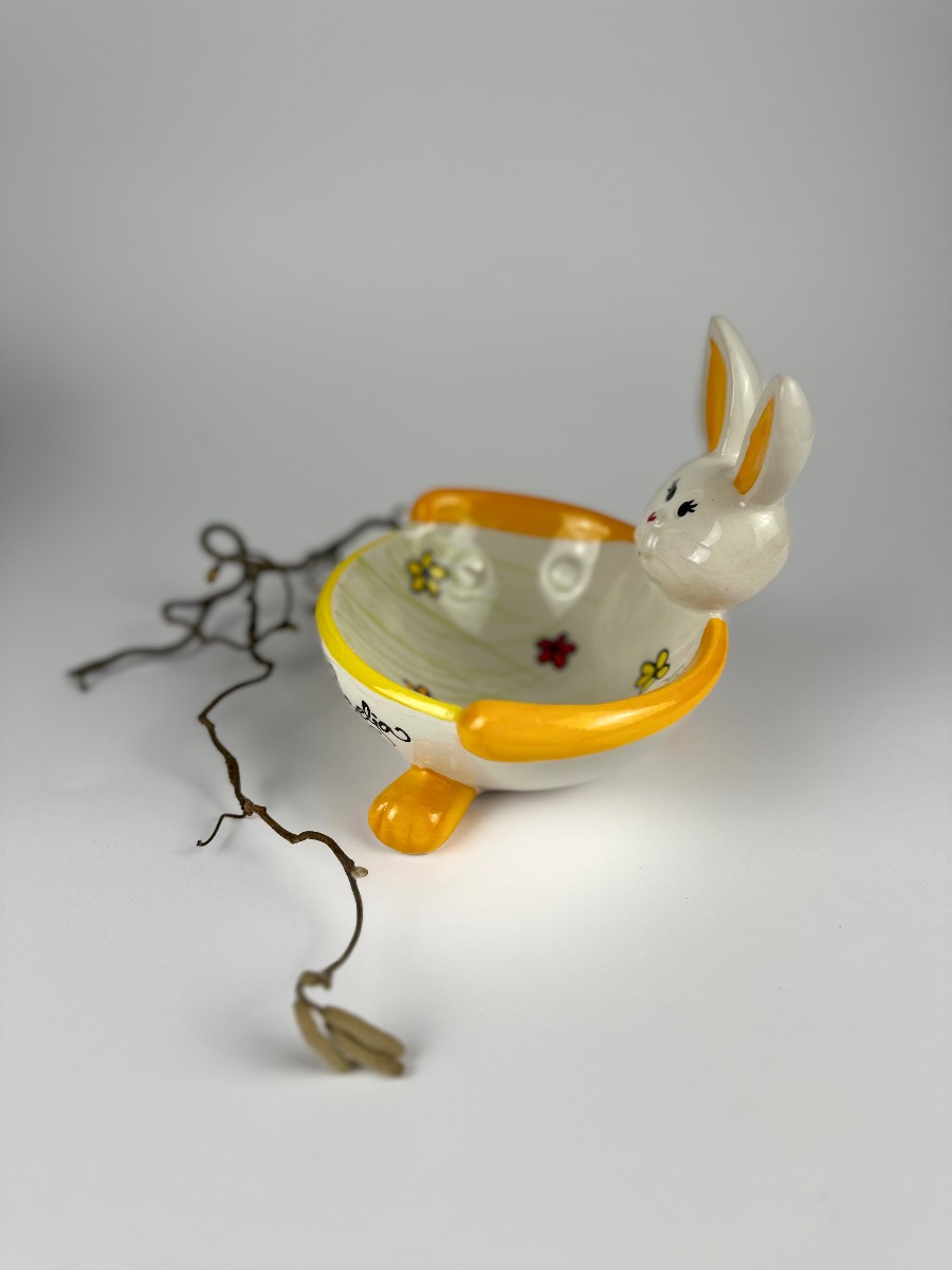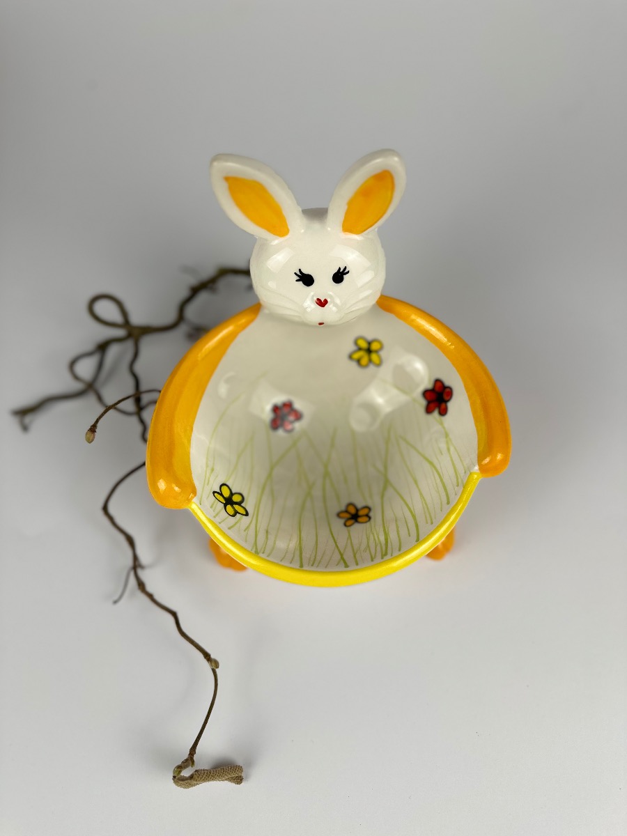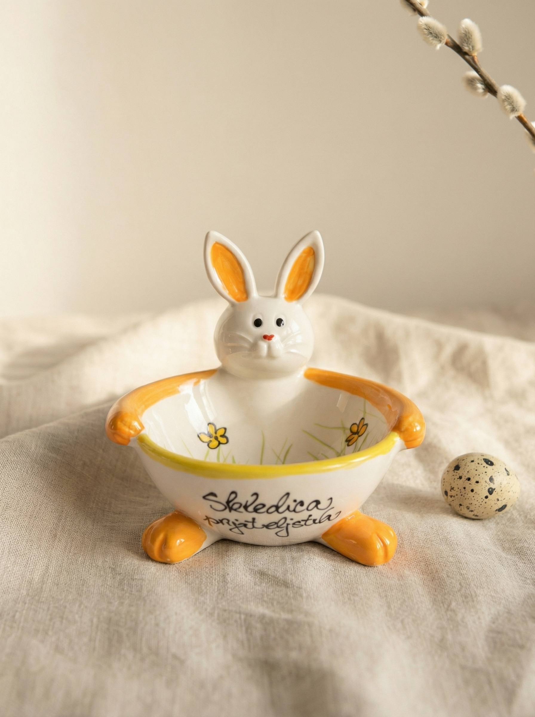 Ročno izdelana in poslikana skledica, ki jo napolnite z jajčki za praznike.. Zaradi svoje praktičnosti in unikatnosti je izdelek odlično darilo, saj ga vsak lahko uporablja na sebi primeren in drugačen način. Skleda je izdelana iz visoko kvalitetne bele gline ter žgana na visoki temperaturi(1050), kar ji daje trdnost in odpornost ter možnost čiščenja v pomivalnem stroju.