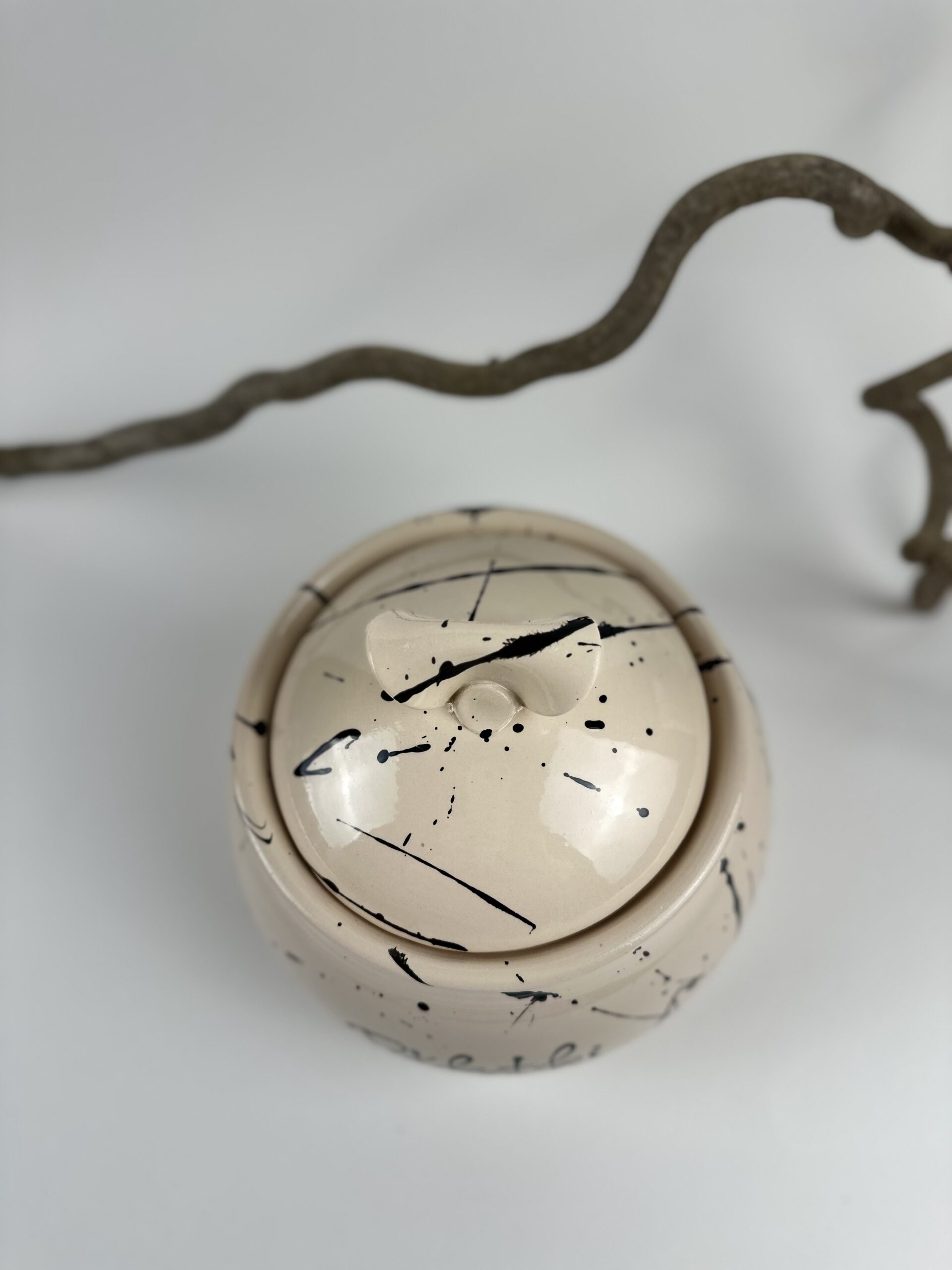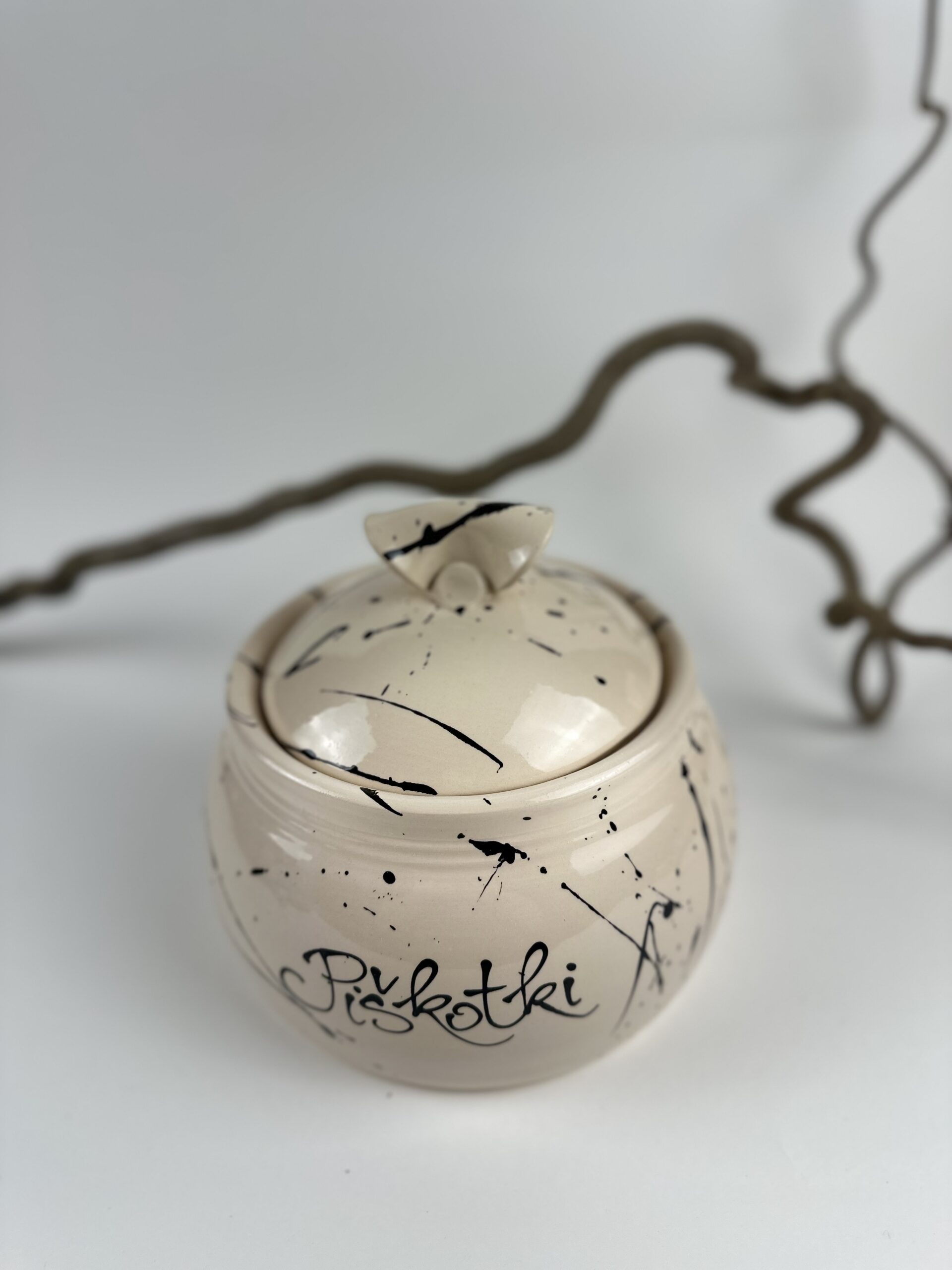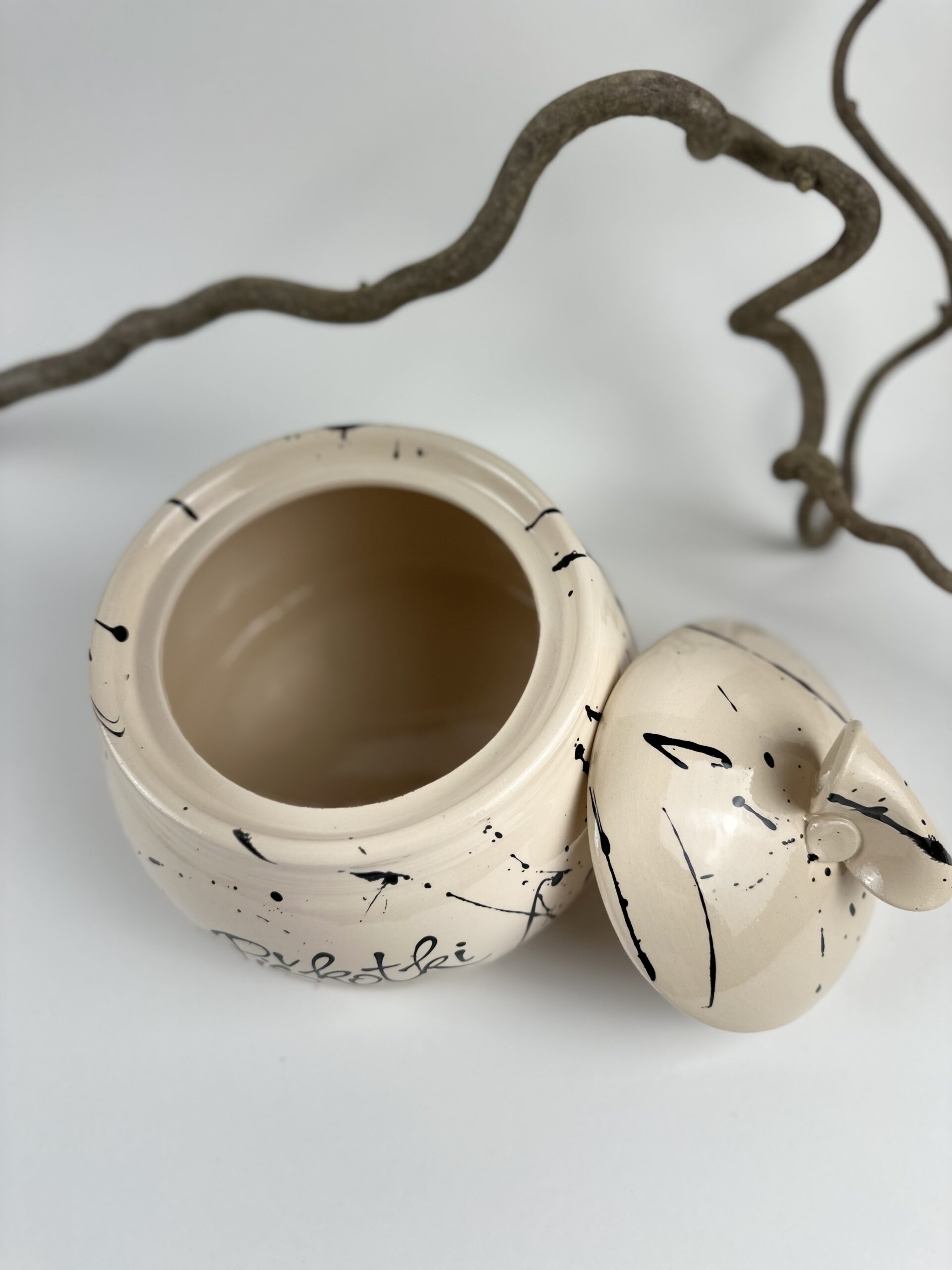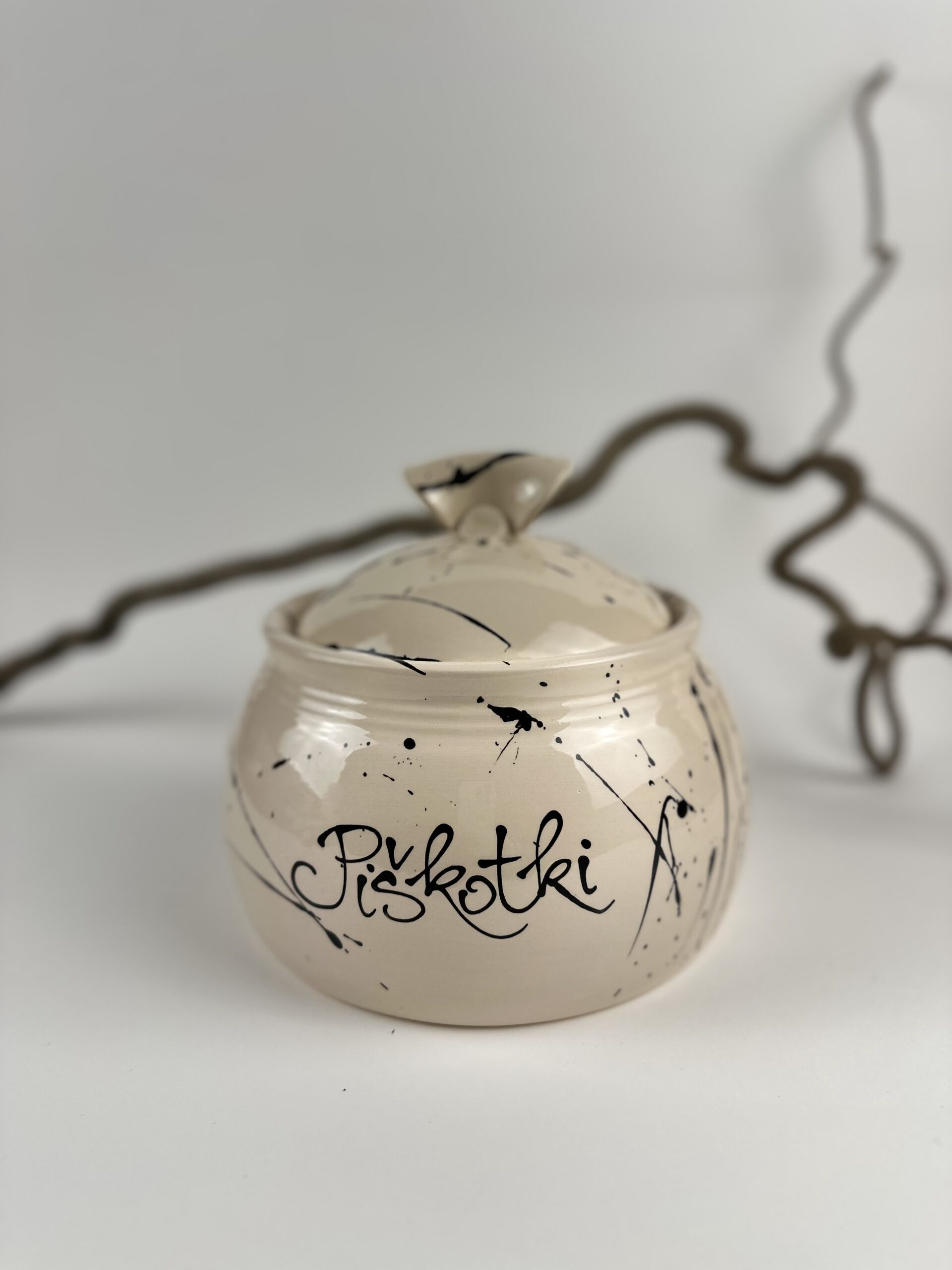 Ročno izdelan keramični piškotnik srednje velikosti s pokrovom, popoln za shranjevanje piškotov ali drugih dobrot, ki jih želiš imeti vedno pri roki. Elegantna oblika s pokrovom, ki lepo zapre vsebino, doda estetski dotik kuhinjski polici ali mizi, pripravljeni na obiske.