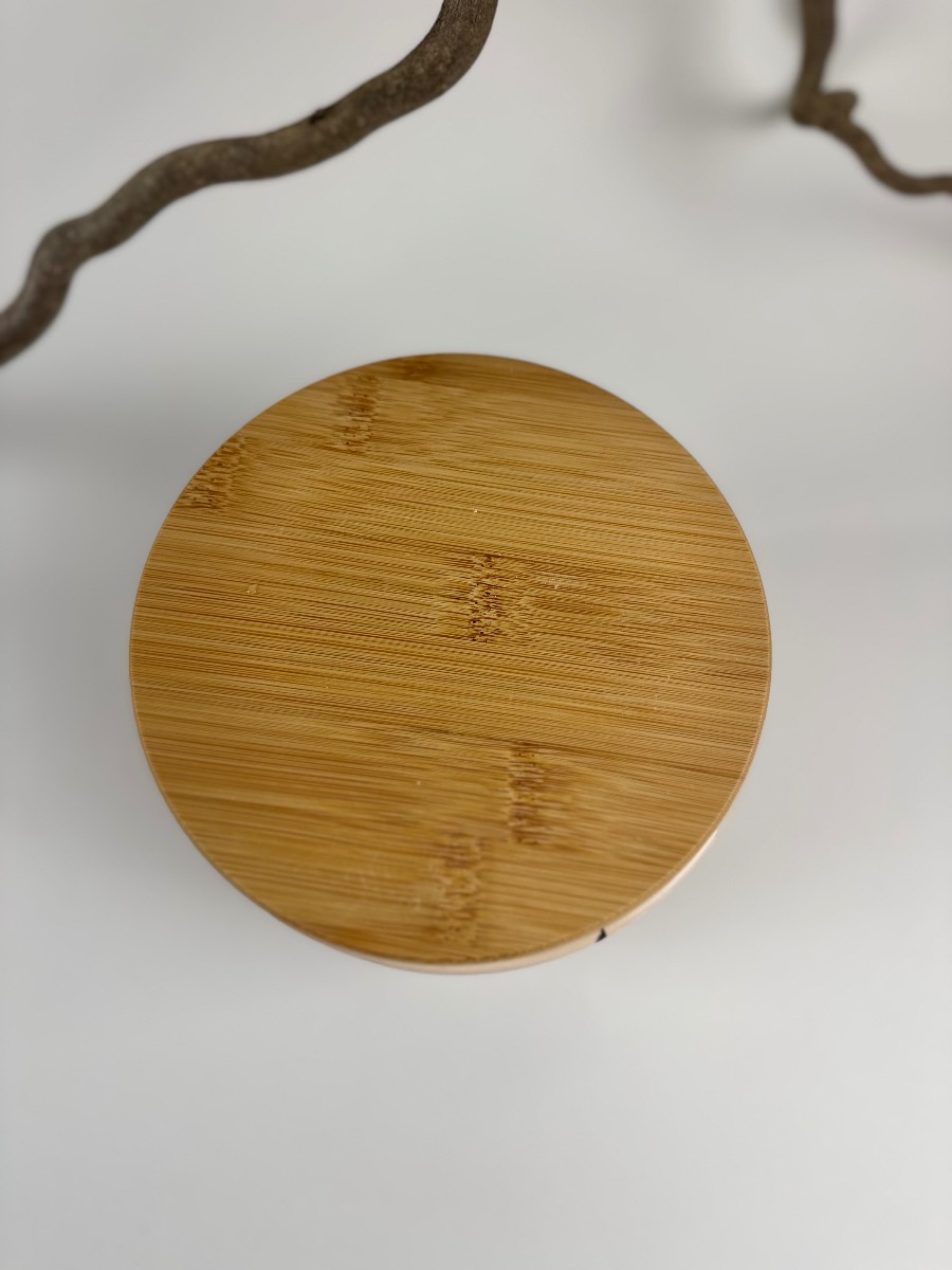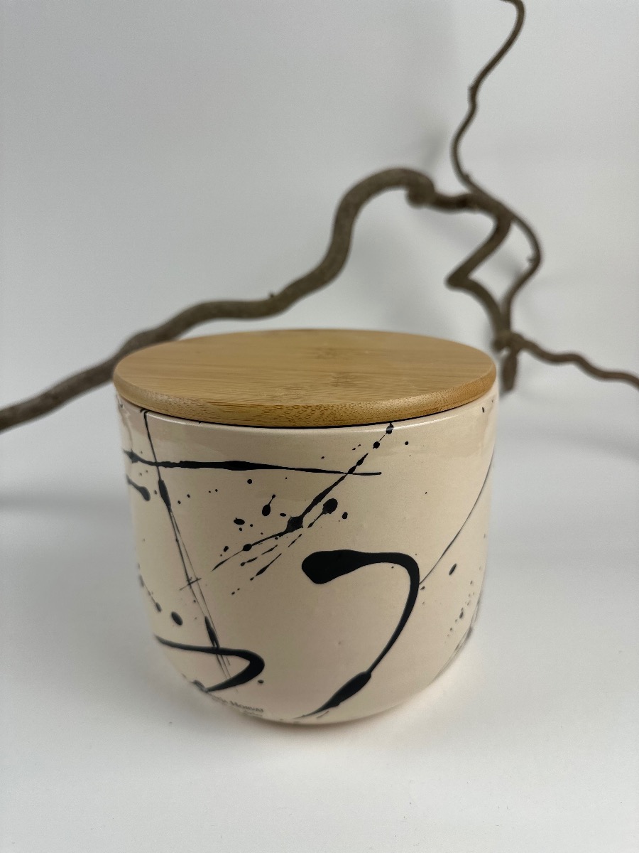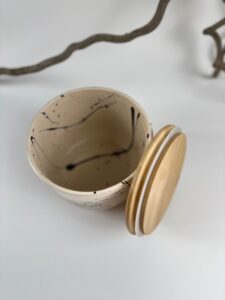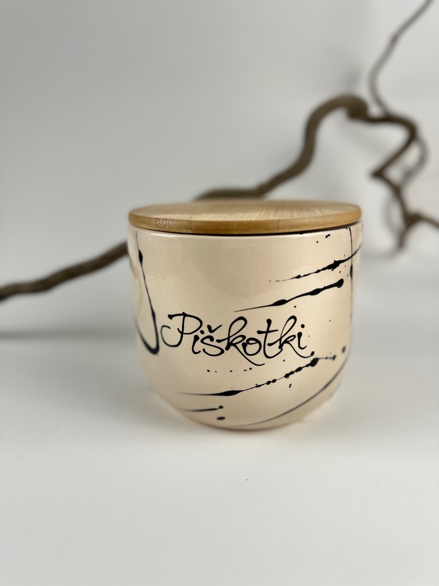 Ročno izdelan keramični piškotnik srednje velikosti z lesenim pokrovom, ki lepo zatesni in ohrani svežino vsebine.Popoln za piškote, ki jih želiš imeti pri roki in lepo shranjene. Topla kombinacija keramike in lesa doda naraven, estetski dotik tvoji kuhinji ali mizi.