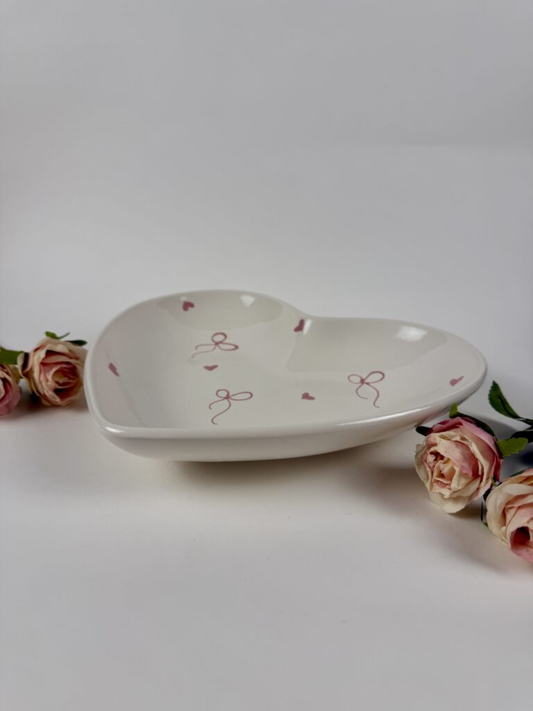 Ročno izdelana keramična skleda v obliki srca, popolna za trenutke, ko želiš nekaj podariti ali postreči z ljubeznijo. Uporabiš jo lahko za piškote, drobne prigrizke, nakit ali kot poseben dekorativni detajl na mizi.